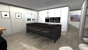 Remodelació d’una cuina amb illa central, colors foscos elegants, materials de roure, combinació de gres i parquet, mobles lluminosos i silestone negre per destacar.